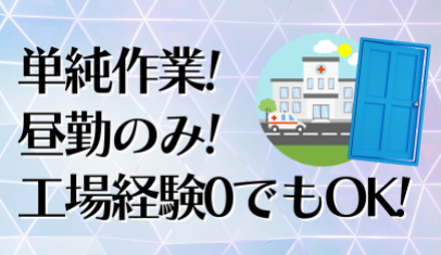 病院のドアの加工(昼勤のみ) 病院などの建物に必要不可欠であるドアを作っている工場です。 やってもらうお仕事は機械オペレータと溶接です。 ・機械のオペレーター 製品を曲げる為に機械に設置してボタンを押すだけの作業をやってもらいます。 ・溶接作業 部品と部品をくっつける簡単な溶接作業をやってもらいます。
